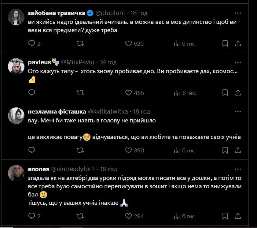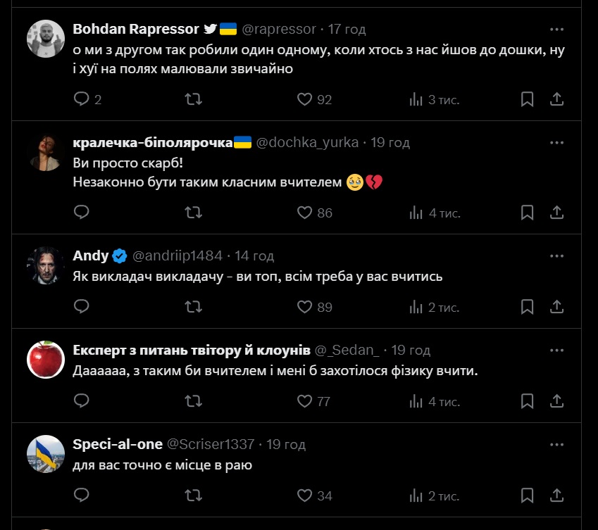 Твіт розчулив українців, вони висловлювали повагу вчителю в коментарях. Допис набрав понад 100 тисяч переглядів і 5 тисяч лайків за добу, а також викликав масштабне обговорення щодо методів роботи вчителів – сучасних і тих, хто працював 20-30 років тому.