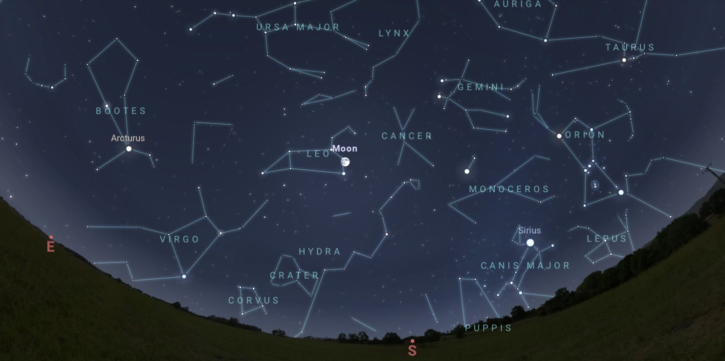 Видиме сходження Місяця відбудеться лише о 17:22. Він з"явиться на небі на сході у сузір"ї Лева і мандруватиме небом всю ніч, аби зайти о 7:15 наступного ранку.
