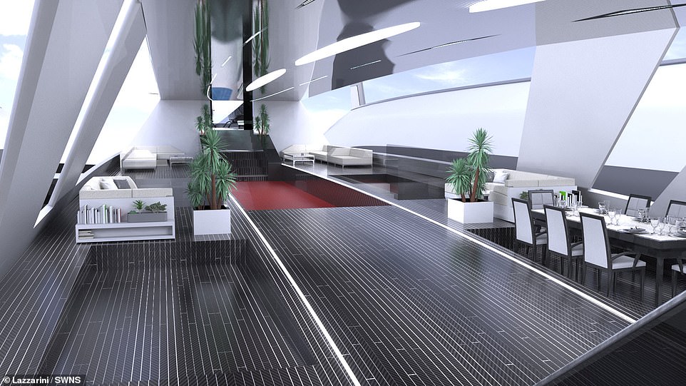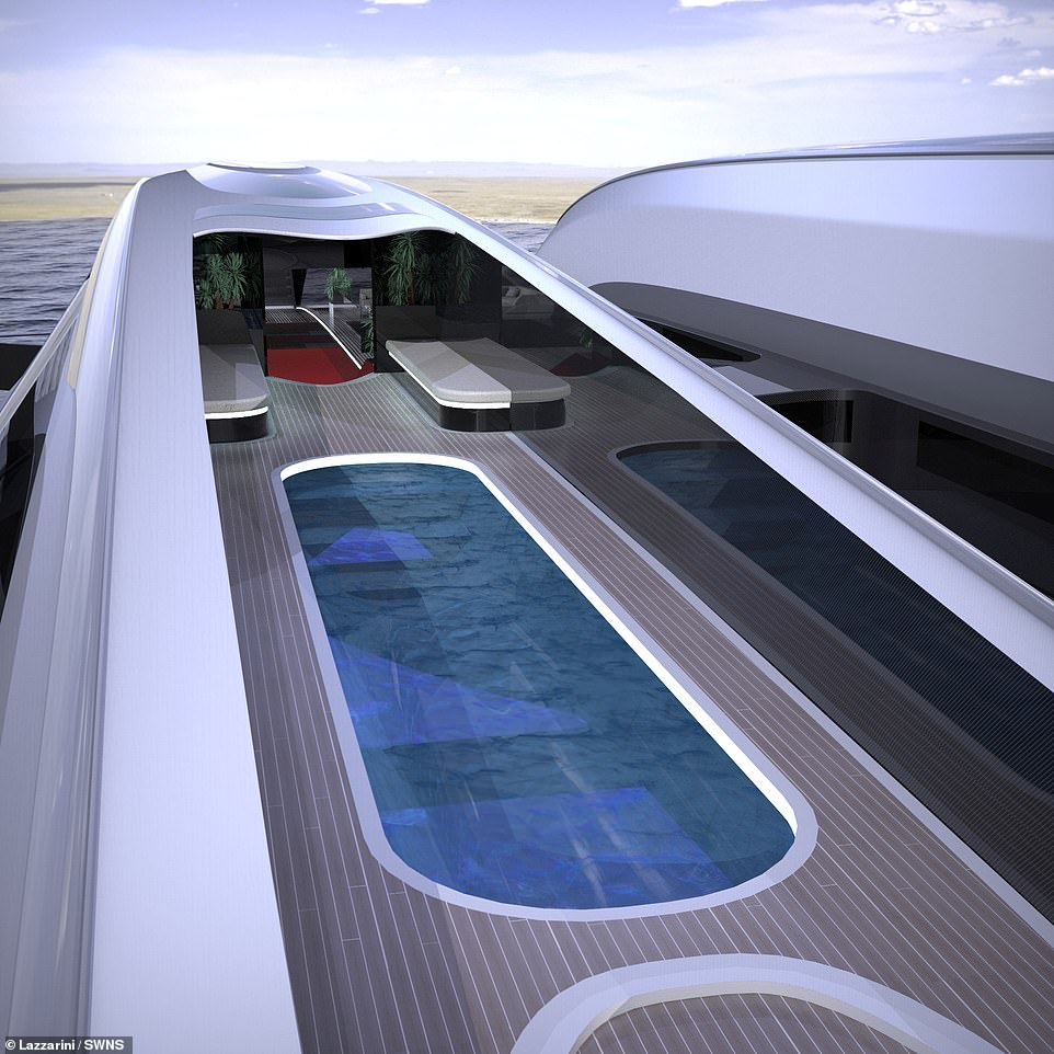 На яхті є місця для апартаментів, номерів класу люкс і навіть простора оглядова платформа, де пасажири зможуть милуватися хвилями або ж дихати свіжим повітрям під час польоту.