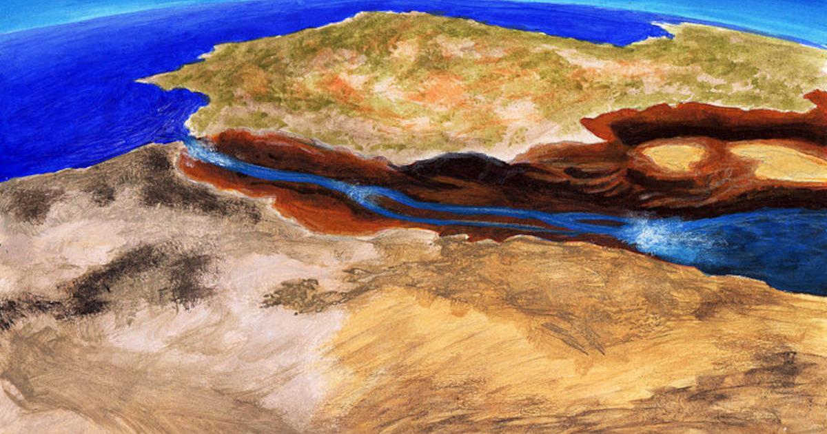 художня інтерпретація затоплення Середземного моря через Гібралтарську протоку; 5,3 мільйона років тому.
