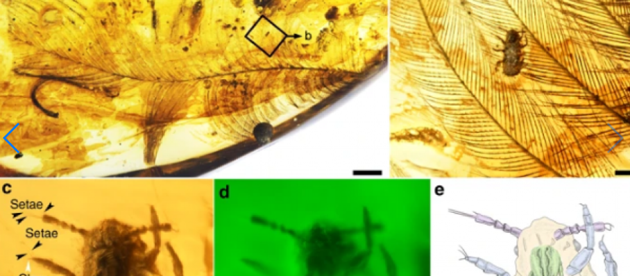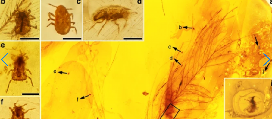 Вчені переглянули величезну кількість зразків бурштину з півночі М'янми, серед яких знайшли тільки два з пір'ям динозавра довжиною 12,7 і 13,6 мл, на яких були присутні ці комахи.