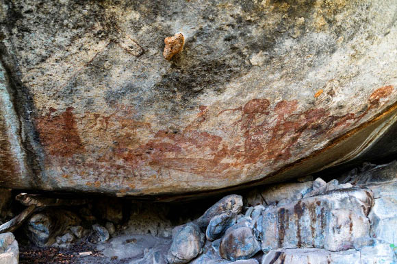 Серед малюнків, вік яких не менш ніж кілька сотень років (точного датування не існує), виділяються три антропоморфні зображення - людей з головами буйволів.