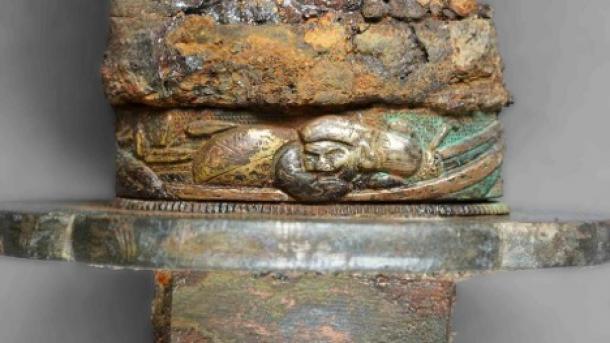 Під шарами корозії на мечі фахівці виявили невеликий наконечник, прикрашений мотивом Дайкоку, одного із семи японських богів удачі. Дайкоку легко впізнати за його знаменитим молотом і рисовим мішком, символами процвітання й удачі. Крім того, на гарді меча виявили прикраси з мотивами хризантеми, що додатково вказує на його японське походження та датує знахідку періодом Едо (17-19 століття).