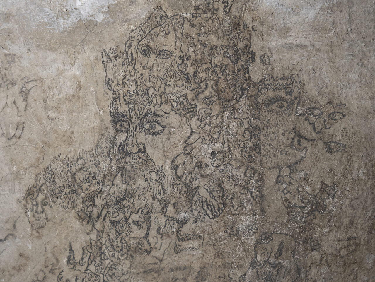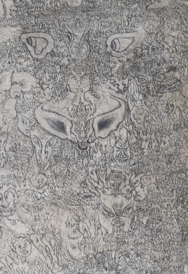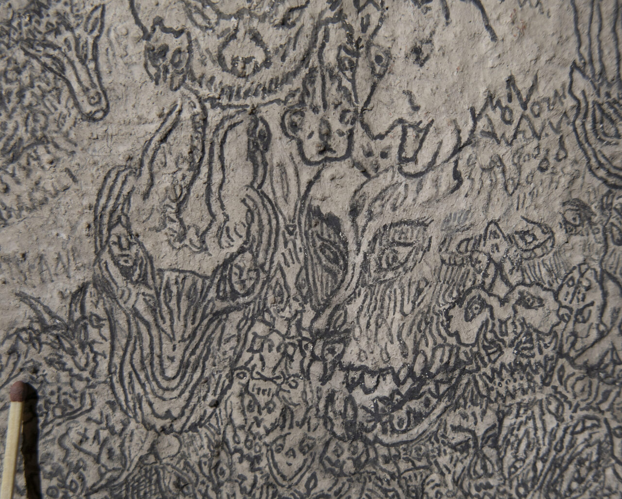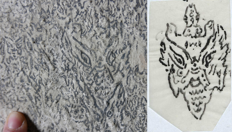 Соткані із щільних чорних ліній малюнки зображають демонів, тварин, кліриків, принцес тощо. Один малюнок пов'язаний з іншим, всі переплетені разом у найдрібніших деталях. Вони покривають стіну на всю ширину і висоту - від арки на висоті 8,5 футів над підлогою до вершини на рівні стелі. Фігурки в деяких частинах малюнку настільки крихітні, що їх не видно з підлоги храму неозброєним оком.
