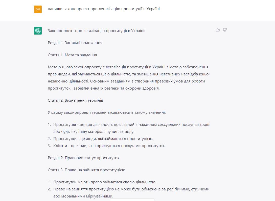 Міністр юстиції Денис Малюська, розважаючись, попросив ChatGPT написати законопроект про легалізацію проституції в Україні, який був готовий вже за 30 секунд.