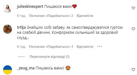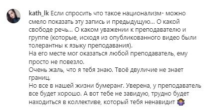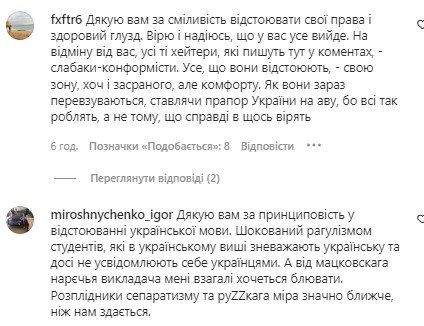 Водночас багато користувачів соцмережі підтримали студентку в її проактивній позиції та боротьбі за право навчатися державною мовою в українському університеті, а також побажали їй сил та наснаги, щоб витримати булінг зі сторони інших студентів.
