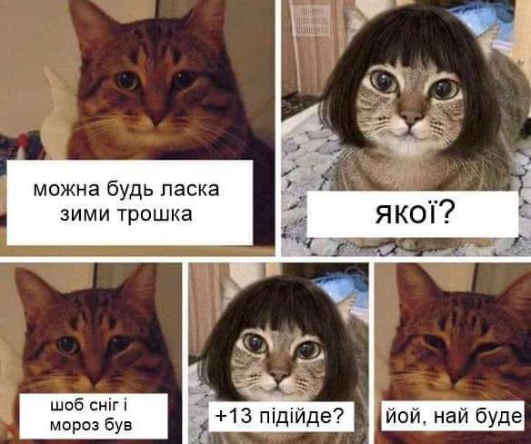 Так, на фото зображений кіт, який нібито знаходиться в магазині і просить у продавщиці "трохи зими" і уточнює, що йому зі снігом і морозом. У відповідь продавщиця каже, що є тільки з температурою в +13 градусів і кіт погоджується.