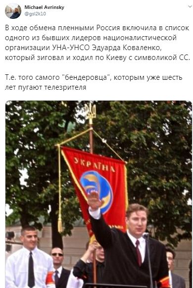 ході обміну полоненими Росія включила в список одного з колишніх лідерів націоналістичної організації УНА-УНСО Едуарда Коваленка, який зіговал і ходив по Києву з символікою СС. Тобто того самого "бандерівця", яким вже шість років лякають телеглядача", - написав у своєму акаунті користувач мережі Михайло Аврінський.