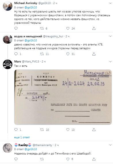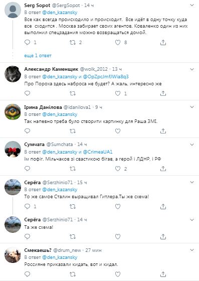 "Все як завжди відбувалося і відбувається. Все йде в одну точку куди все сходиться. Москва забирає своїх агентів. Коваленко один з них виконав спецзавдання можна повертатися додому", "Те ж саме, Сталін вирощував Гітлера. Та ж схема", "Ну то тобто ти натурально шість років з усіх прасок кричиш, що борешся з українськими фашистами, а потім сам потихеньку рятуєш одного з тих, кого дійсно можна назвати фашистом, з української в'язниці", "Давно відомо, що багато українських зігометів - це агенти КДБ, які працюють на підрив іміджу України перед заходом", - пишуть в коментарях.