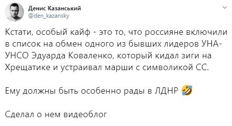 "До речі, особливий кайф - це те, що росіяни включили в список на обмін одного з колишніх лідерів УНА-УНСО Едуарда Коваленка, який кидав зиги на Хрещатику і влаштовував марші з символікою СС. Йому повинні бути особливо раді в ЛДНР. Зробив про нього відеоблог", - пише він.