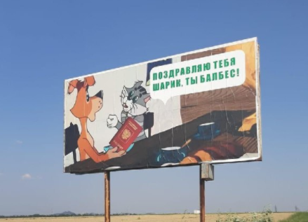 Між містами Волновахою і Курахово на півдні Донецької області помітили білборд, що висміює власників російських паспортів, які хочуть взяти участь в голосуванні на майбутніх виборах в Держдуму РФ.