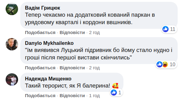 У коментарях багато користувачів соцмереж також згадали про "луцького терориста". Однак ще й жартома припустили, що напад на Кабмін міг зробити актор з "95 кварталу" або навіть Арсен Аваков.