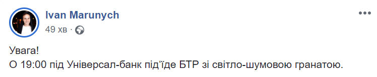 "Увага! О 19:00 під Універсал-банк під"їде БТР зі світло-шумовою гранатою", - жартує в мережі Іван Марунич.