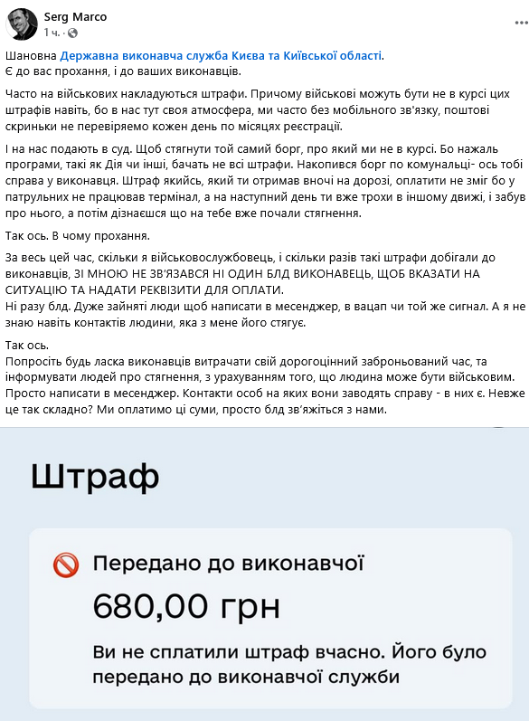 Український військовий Олександр Карпюк (Serg Marco) звернувся з проханням до Держвиконавчої служби інформувати бійців про виконавчі провадження. Часто військовослужбовці не здогадуються про наявність штрафів.