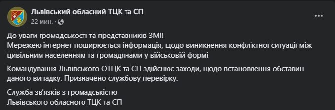 Там зазначили, що перевірку розпочали після того, як у мережі поширилось відео з конфліктною ситуацією між простим громадянином та людьми у військовій формі.