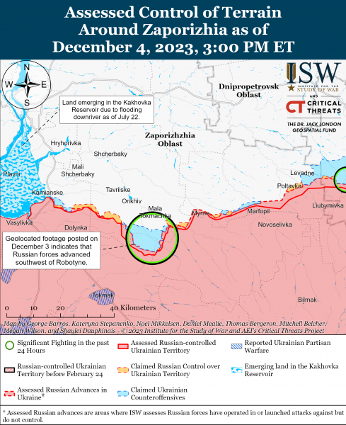Російські війська продовжували наземні атаки в районі кордону Донецько-Запорізької областей, але 4 грудня не мали жодних успіхів.
