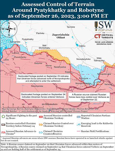 Українські сили проводили наступальні операції на заході Запорізької області та, як повідомляється, просунулися 26 вересня. Російський "воєнкор" стверджував, що українські сили досягли північної околиці Новопрокопівки. Інший військовий блогер з РФ стверджував, що українські війська просунулися на північний захід від Вербового. Речник Таврійського угруповання військ України полковник Олександр Штупун 25 вересня заявив, що російські війська продовжують мінувати та будувати укріплення в глибинній лінії оборони на Таврійському напрямку.
