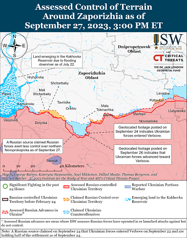 Українські війська 27 вересня продовжили контрнаступальні дії на заході Запорізької області та вийшли на лінію окопів на захід від Вербового (16 км на південний схід від Оріхова). Геолокаційні кадри, опубліковані 26 вересня, показують, як російський безпілотник завдає удару по українській піхоті в траншеї на захід від Вербового, а використання росіянами безпілотників для боротьби з цими українськими силами вказує на те, що російські сили, ймовірно, більше не присутні на лінії траншеї довжиною приблизно один кілометр.