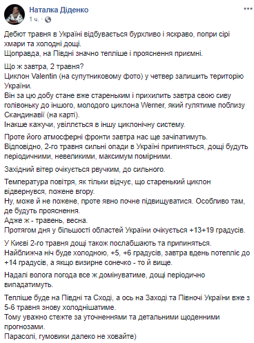 Відповідно, 2-го травня сильні опади в Україні припиняться, дощі будуть періодичними, невеликими, максимум помірними", - написала метеоролог.