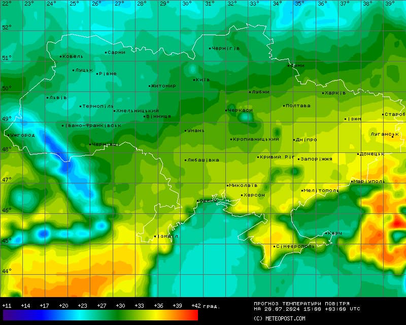Вона зауважила, показавши дві карти прогнозу температури повітря, що прогноз погоди можна вважати обнадійливим. Таким чином перша карта з червоними ділянками температури повітря свідчить про сьогоднішній максимум. Натомість друга карта – те, що українці спостерігатимуть в суботу, 20 липня.