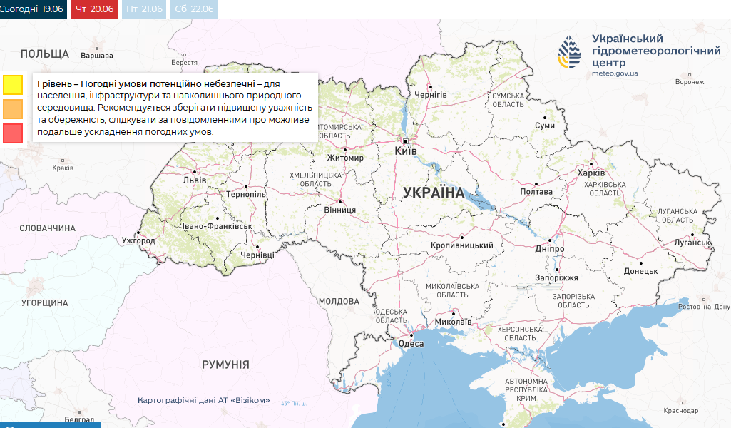 В деяких районах центральних, південних і східних регіонів – вдень град і шквали 15-20 м/с. Це відповідає першому рівню небезпеки.