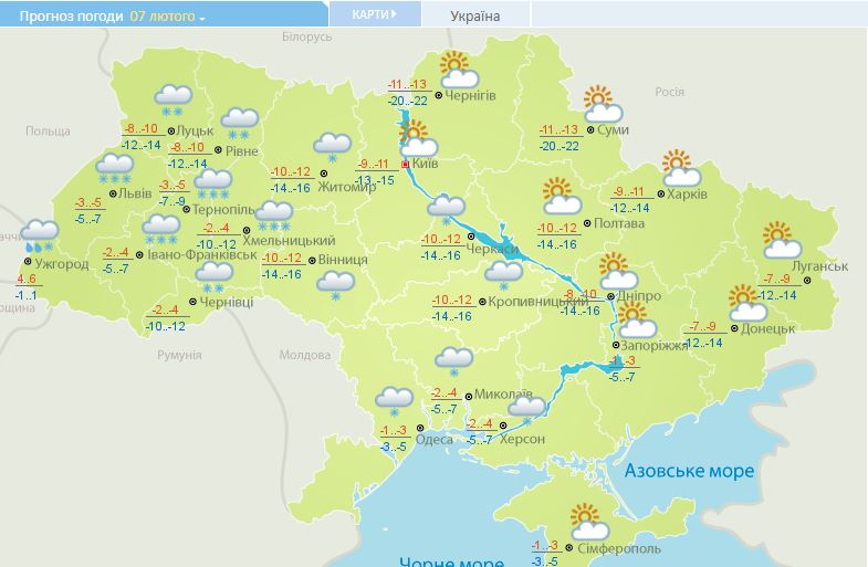 Українцям не варто розлаблятися, оскільки морозна погода буде й у понеділок, 8 лютого, але вже не в усіх областях. Найтепліше буде на Закарпатті та у Криму, де повітря прогріється вдень до +10 градусів.