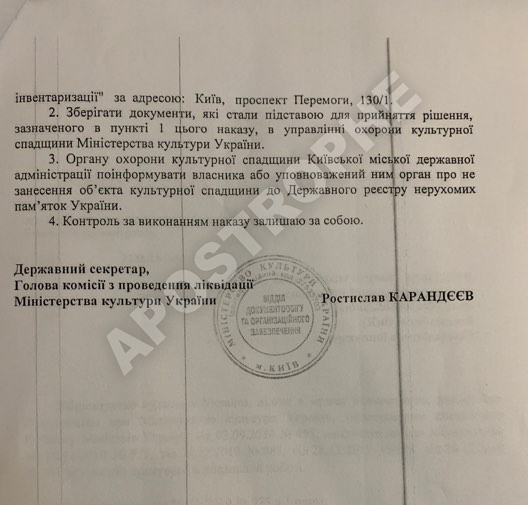 Про це йдеться в копії наказу Мінкульту, яка опинилася в розпорядженні редакції "Апострофа".
