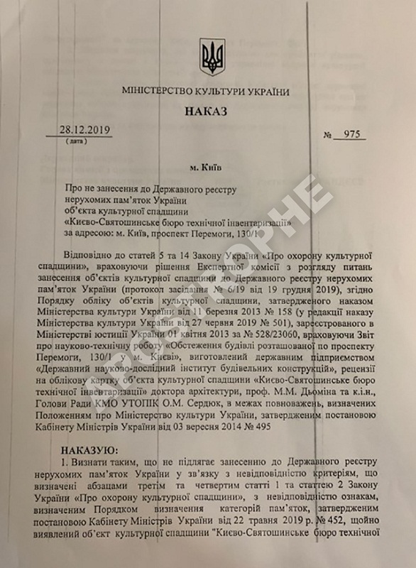 Так, в документі, який підписаний головою комісії з ліквідації Міністерства культури Ростиславом Карандеєвим, зазначено, що "Києво-Святошинське бюро технічної інвентаризації" не відповідає ряду критеріїв охоронюваних законом об'єктів.