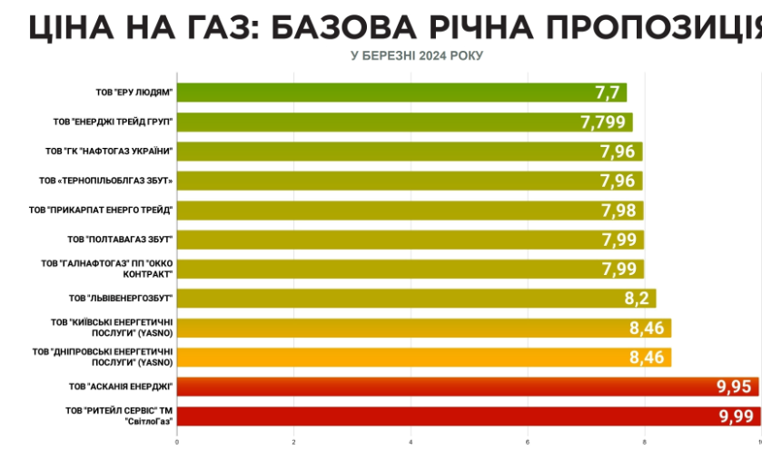 Повідомляється, що свої пропозиції на березень оприлюднили 12 постачальників. Залежно від газопостачальної компанії, вартість кубометра газу в березні коливатиметься від 7,70 до 9,99 грн. При цьому в 7 постачальників ціна кубометра нижча за 8 грн, ще в 5 – вища.