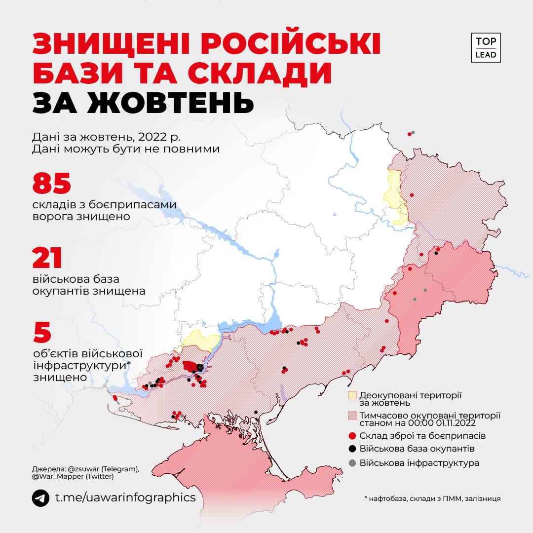 Українські воїни продовжують успішно знищувати військові склади та бази окупантів. За жовтень було знищено щонайменше 111 об'єктів російських загарбників на окупованих територіях.