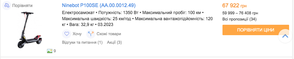 А ось серед рекордсменів за ціною виявився Ninebot by Segway GT1E Black. За нього зараз просять 90136 грн.