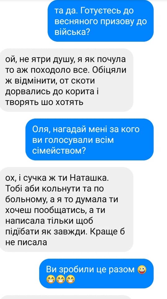 Вона опублікувала скріншоти листування із знайомою стосовно призову.