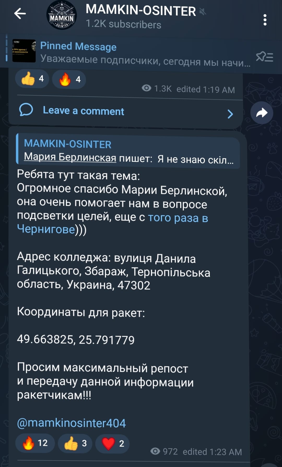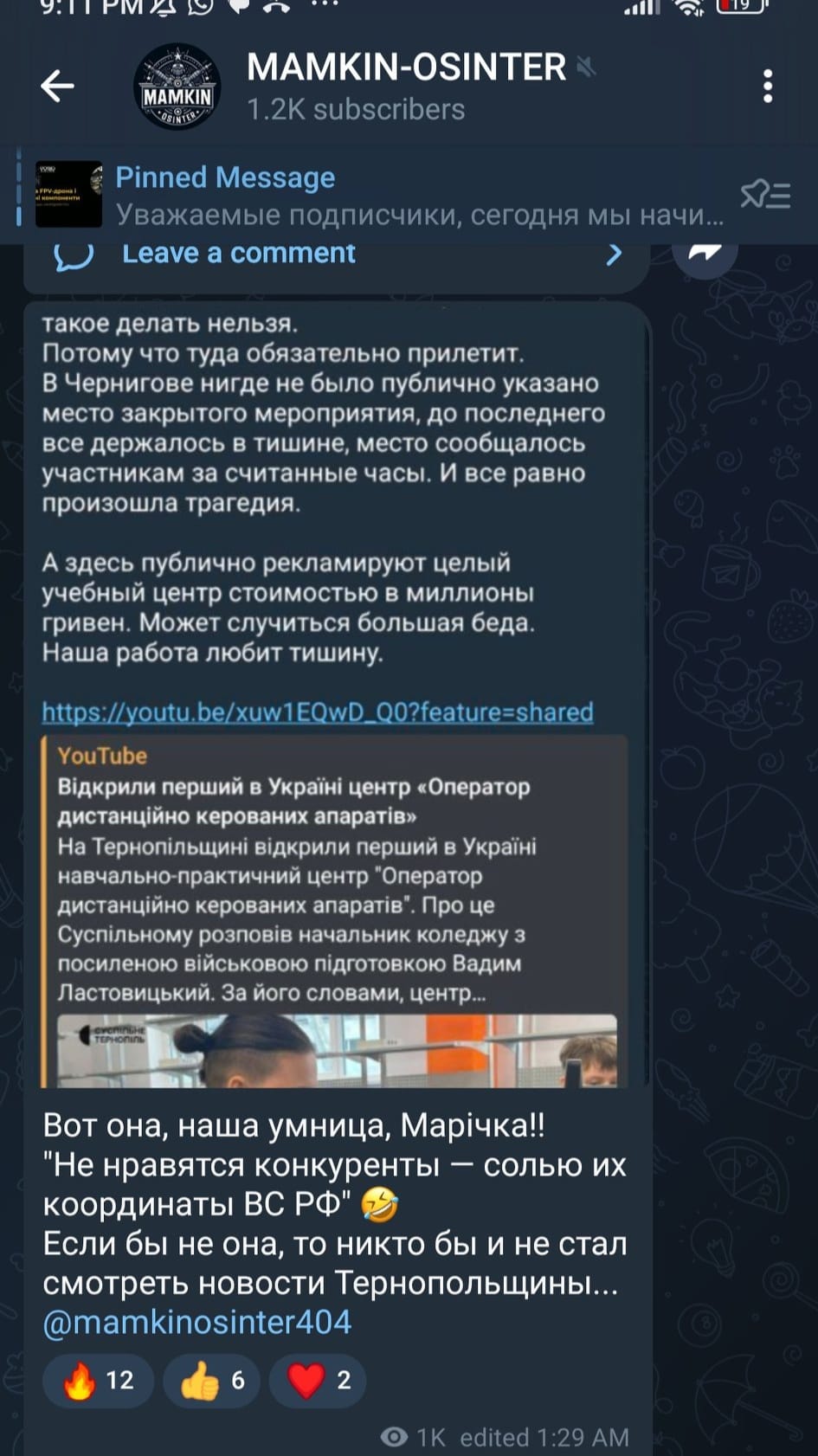 2. Росіяни знаходять цей матеріал і публікують в кількох ТГ з меседжами про ще одну "законную цель". На той момент там вже тисячі переглядів. Публікацію доволі швидко прибирають. Можливо щоб не дати нам знати, що в них поповнився список цілей на цей об'єкт.
