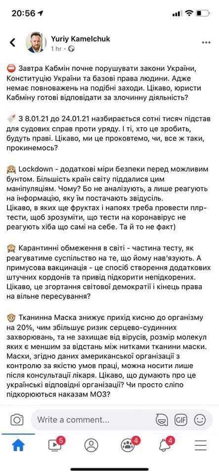 Камельчук назвав карантинні обмеження - "частиною тестування, як буде реагувати суспільство на те, що йому нав'язують".