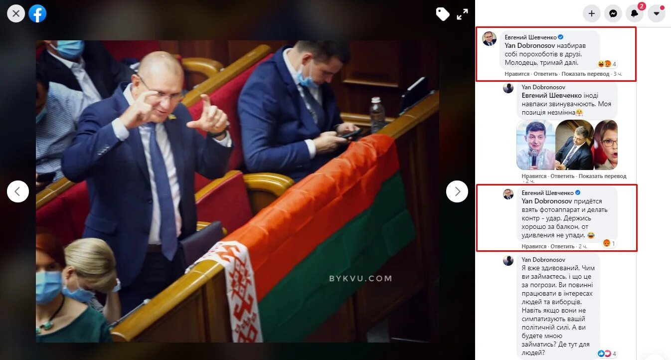 Нардеп писав погрози і висловлював своє невдоволення в Facebook. Там фотокореспондент видання "Букви" Ян Доброносов опублікував знімки із засідання. На фото були політики, Шевченко в тому числі.