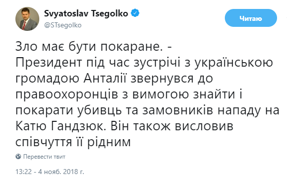 Президент України Петро Порошенко звернувся до правоохоронних органів, аби ті зробили усе можливе, щоб покарати убивць активістки Катерини Гандзюк.