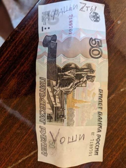 На рублях, які окупанти нав'язують для обігу на окупованих територіях, українці пишуть "Фашисти", "Слава Україні! Героям слава!", "Смерть окупантам", "Крим - це Україна" і навіть "Х*р вам, а не Херсон! ".