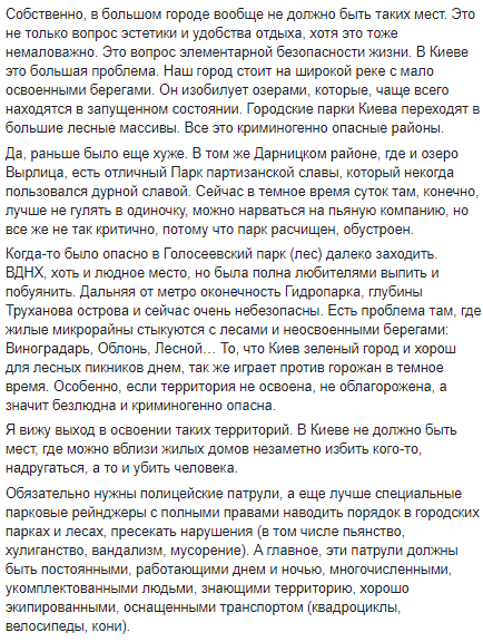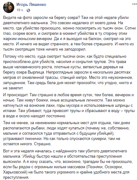 "Місце, куди дивиться тисячі вікон, як ніби спеціально пристосоване для вбивств, насильства і приховування трупів. Це трава вище людського зросту, щільні кущі, гіллясті дерева на березі озера Вирлиця. Непроглядна зарості в декількох десятках метрів від жвавої траси, станцій метро. Місце це недоглянуте, запущене. Там серед білого дня може статися, що завгодно, ніхто і не помітить", - написав Ляшенко.