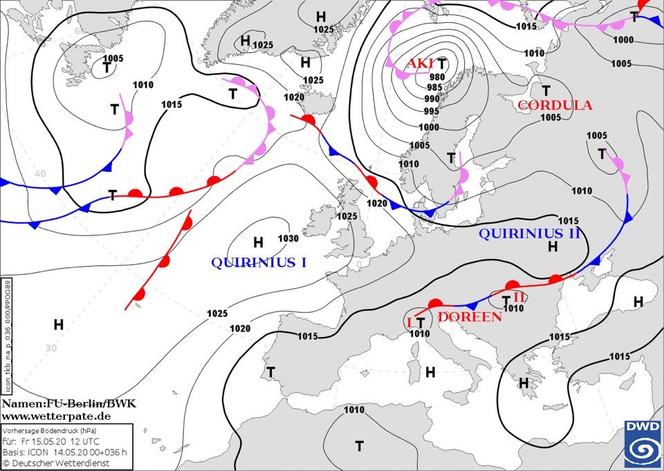 Антициклон Quirinius, центр якого розташований над Атлантикою, в п'ятницю, 15 травня, витіснить дощі на більшій частині України, але в північних областях найближчої ночі очікуються заморозки.