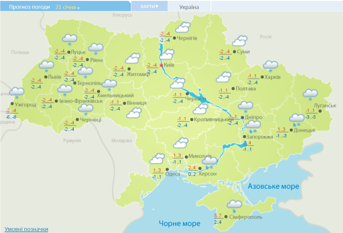 У п'ятницю, 21 січня, на заході країни, а також у Дніпропетровській, Донецькій, Запорізькій, Миколаївській, Одеській, Харківській, Херсонській областях та у Криму, вдень очікуються мокрий сніг, місцями опади. В інших областях, включаючи Київ, вдень без істотних опадів, а вночі очікується сніг.