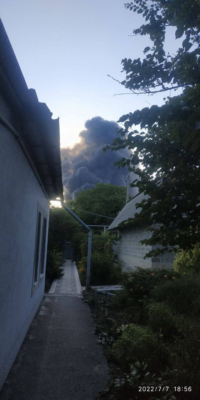 Пишуть, що територіально об'єкт знаходиться у Кіровському районі. Над нафтобазою здіймається стовп густого чорного диму.