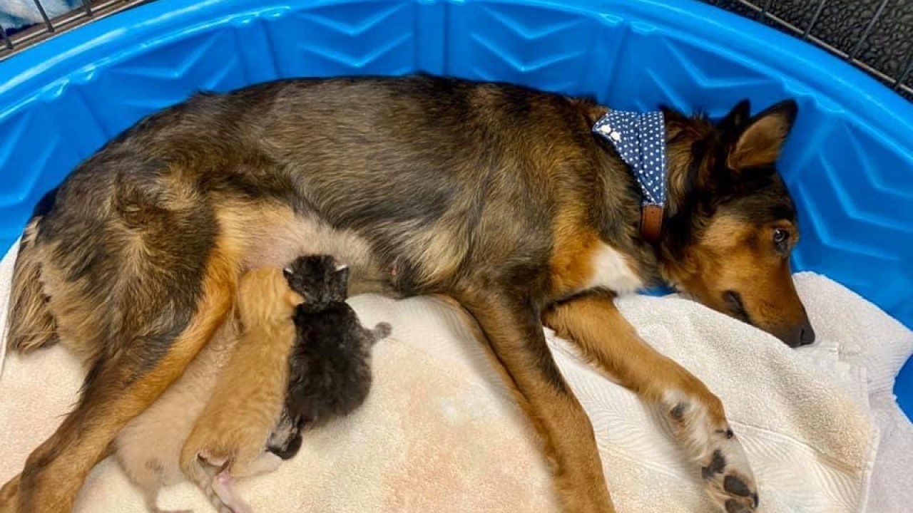 У США вагітна собака-рятувальниця Джорджія трагічно втратила своїх новонароджених цуценят, які народилися в результаті кесаревого розтину мертвими. Однак, сумуючи за своїми дітьми, Джорджія змогла стати мамою для осиротілих кошенят.