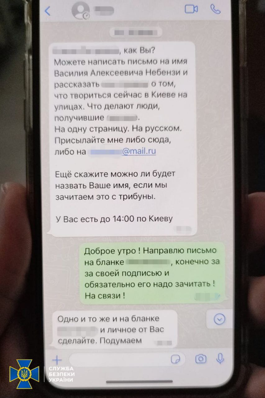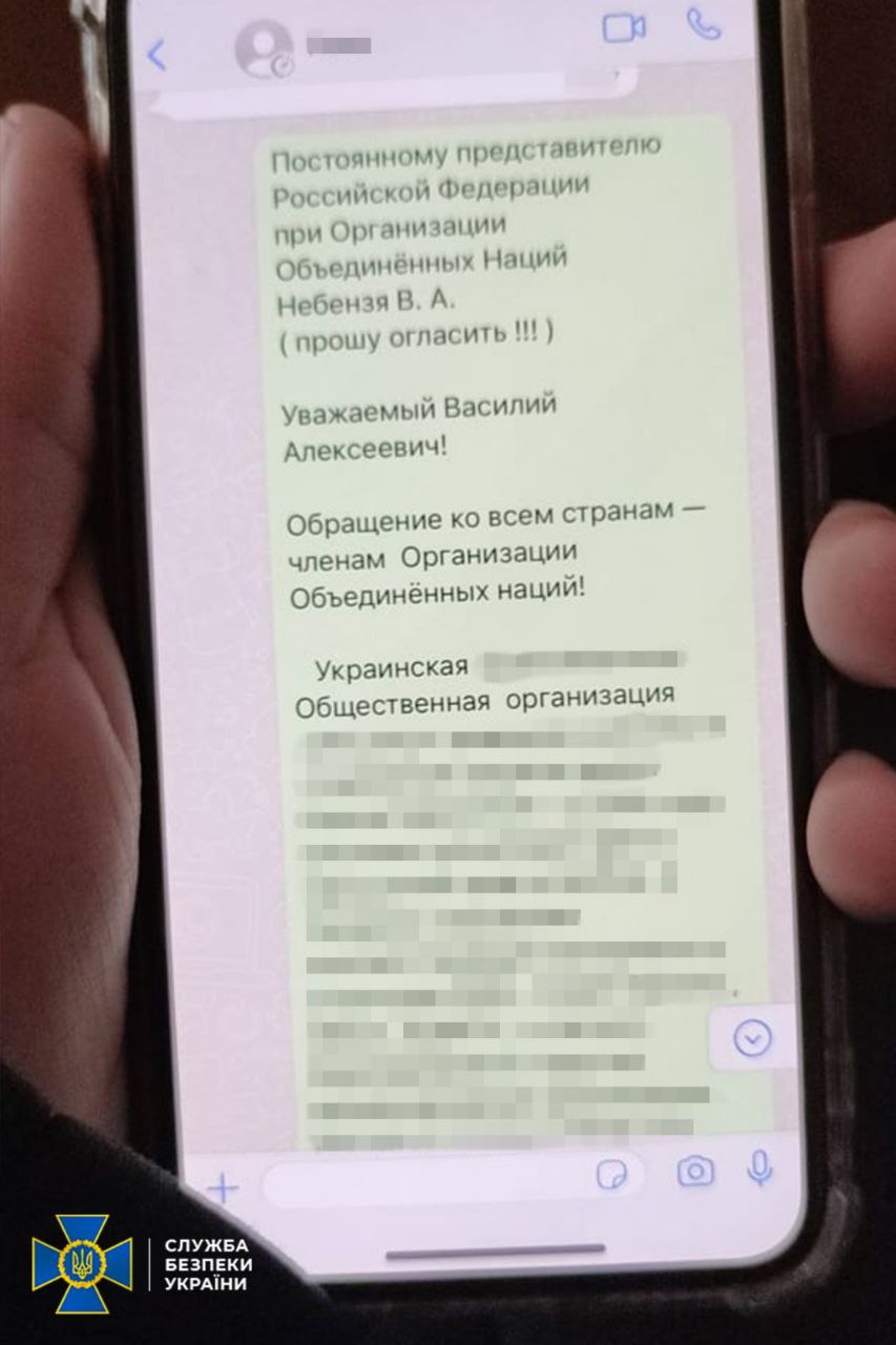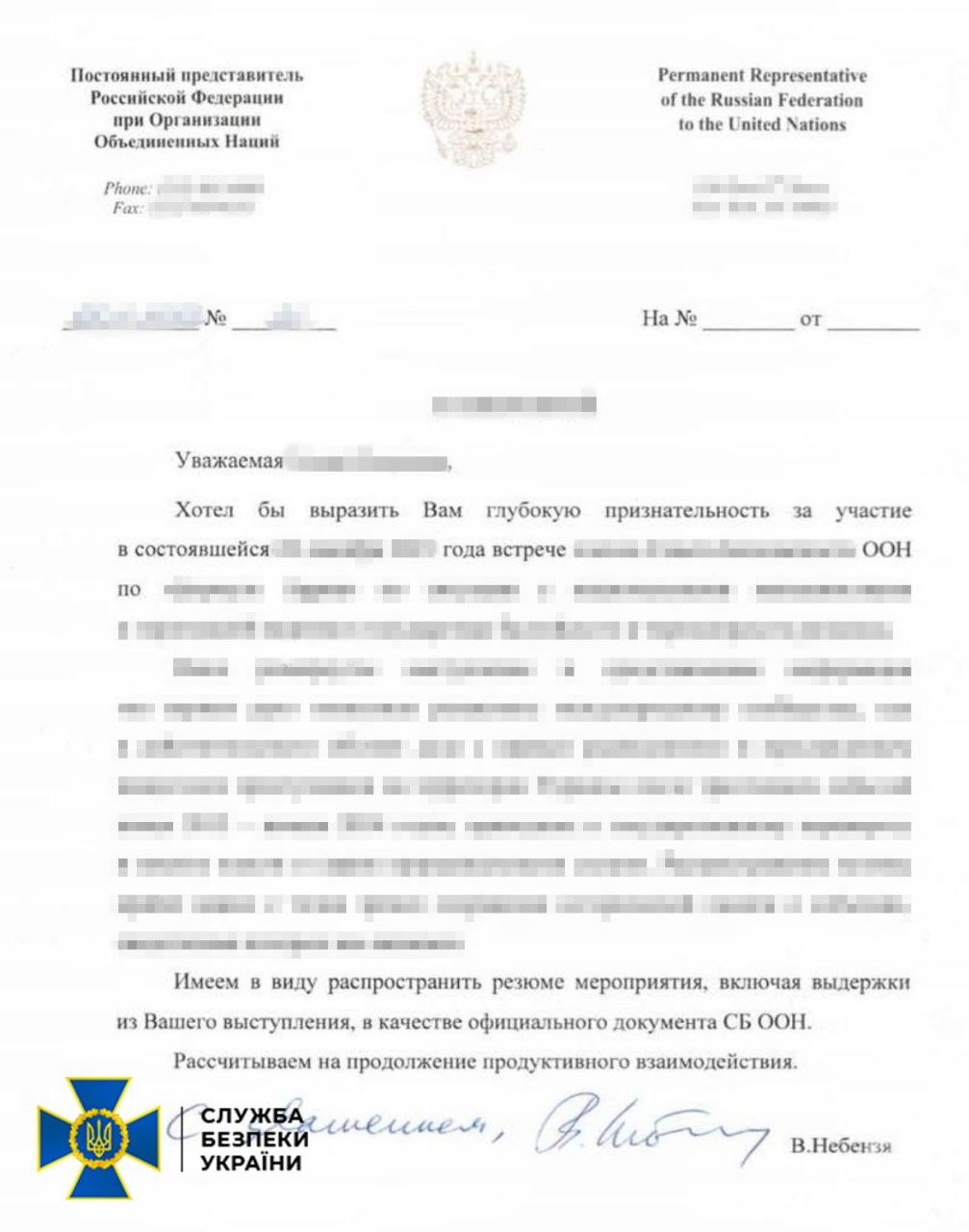 "Готувала тези промови постійного представника РФ при ООН для 11-ї сесії Генеральної Асамблеї, що проходила у перші дні повномасштабного вторгнення Росії. Тоді постпред країни-агресора використав офіційний лист очільниці громадської організації для дискредитації України на міжнародній арені та виправдовування збройної агресії РФ", - з'ясувало слідство.