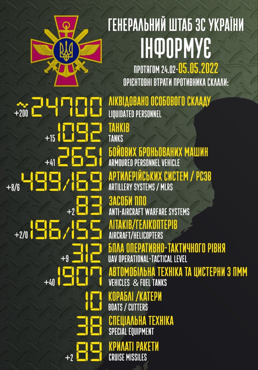 Про загальні бойові втрати ворога станом на 5 травня повідомляють у Генштабі ЗСУ.