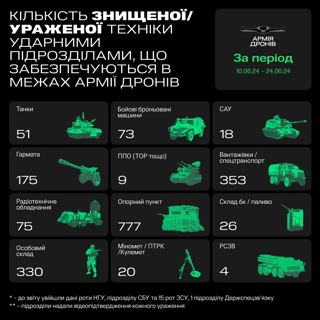 За словами голови Мінцифри Михайла Федорова, з 10 по 24 червня ударним підрозділам БпЛА вдалося вивести з ладу 778 одиниць російської техніки.