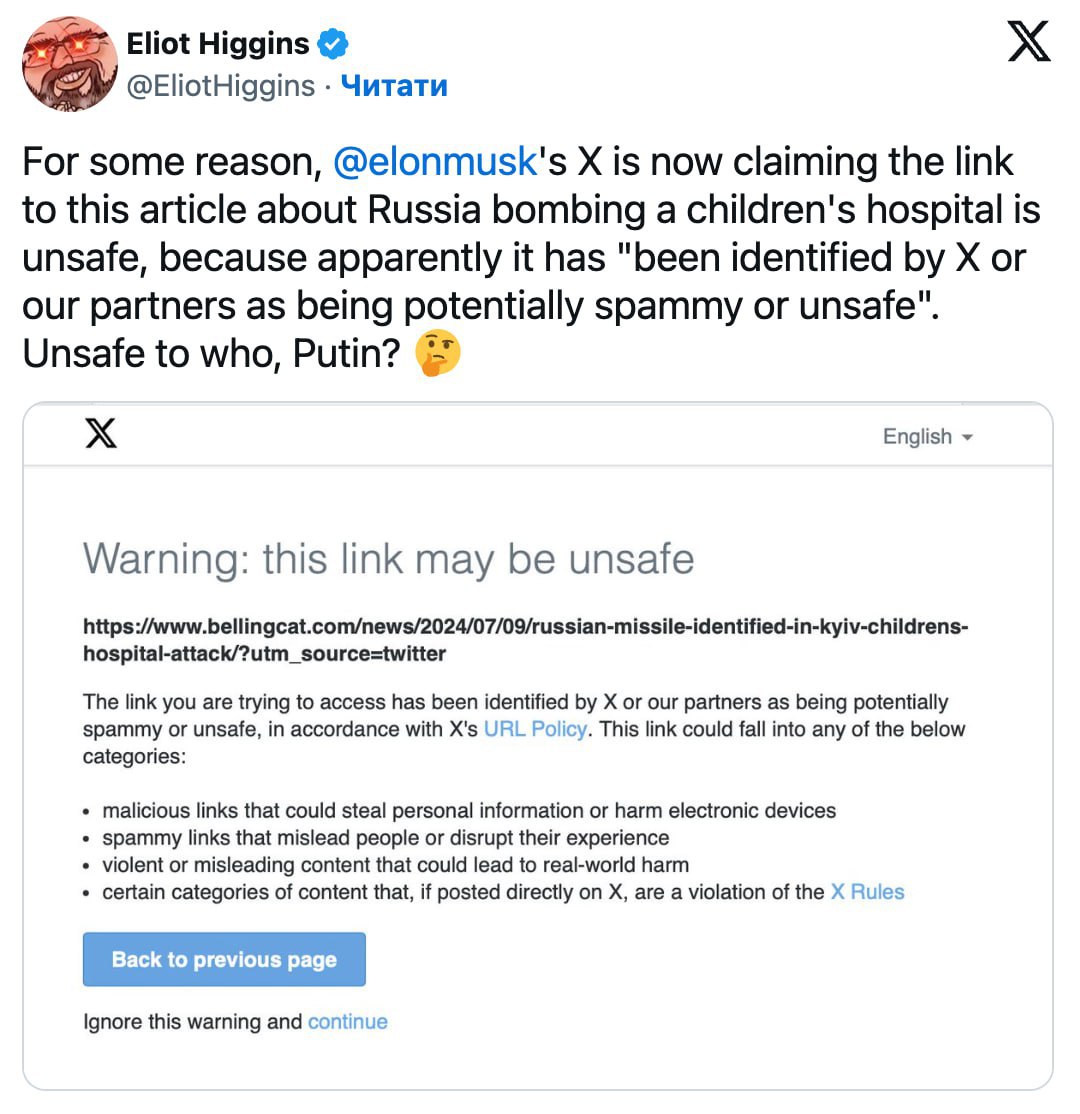 "Чомусь X тепер стверджує, що посилання на цю статтю про бомбардування Росією дитячої лікарні є небезпечним, оскільки, очевидно, воно "було визначено X або нашими партнерами як потенційно спамне або небезпечне". Небезпечним для кого, для Путіна?", – написав він на своїй сторінці в Х, додавши відповідне попередження.