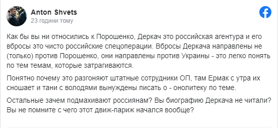"Він говорив як президент, який хоче зберегти стосунки з агресором, який топче твою землю і вбиває твоїх співгромадян, - обурюється журналіст. - Слабка політика завжди буде отримувати зневагу Росії. Вони розуміють тільки тоді, коли їх вбивають більше, ніж можуть вбити вони".