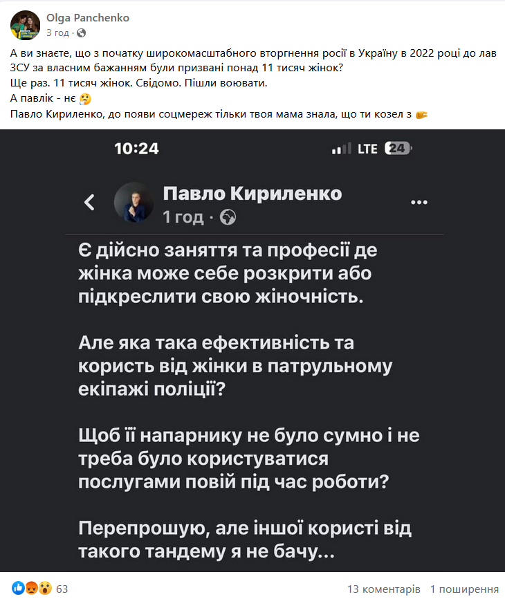 "Ну на якого лисого в екіпажі поліції тепер мають бути жінки? Не буду розповідати, що місце жінки - Kinder, Küche, Kirche (Діти, кухня, церква, - Апостроф). Є дійсно заняття та професії де жінка може себе розкрити або підкреслити свою жіночність. Але яка така ефективність та користь від жінки в патрульному екіпажі поліції? Щоб її напарнику не було сумно і не треба було користуватися послугами повій під час роботи?" - сказав експолітик.