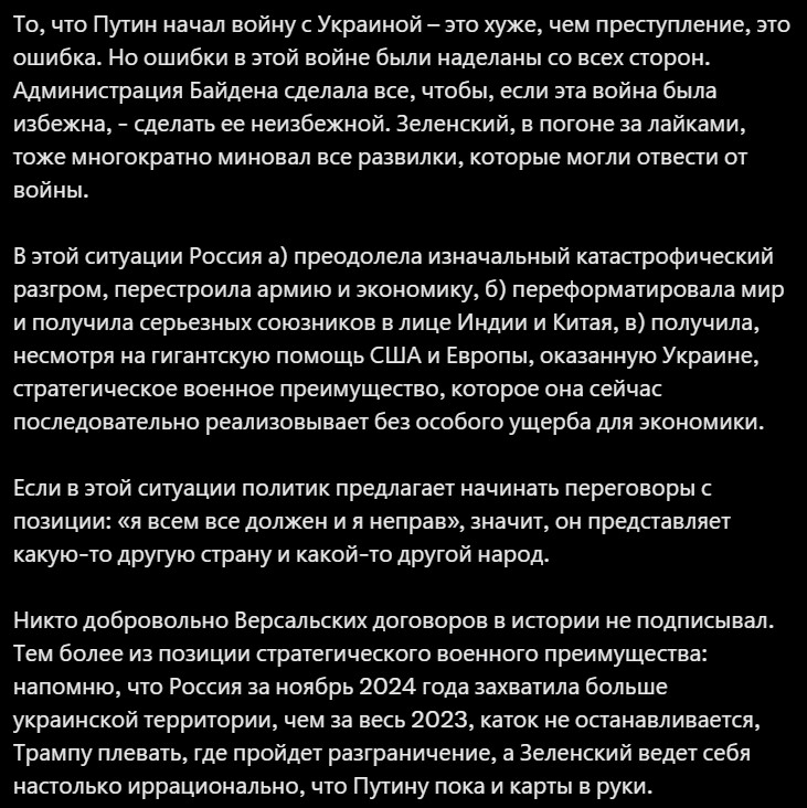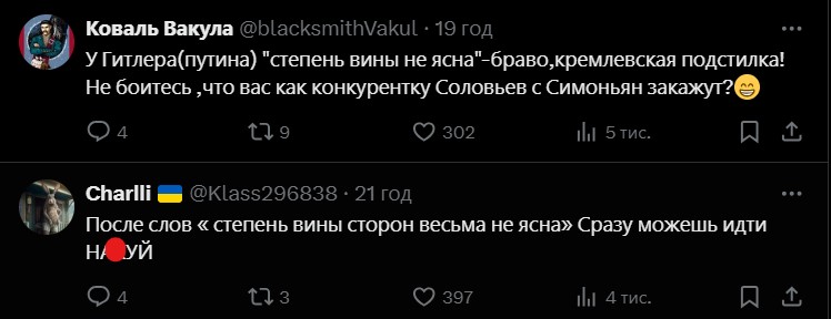 "Але помилки в цій війні були нароблені з усіх боків. Адміністрація Байдена зробила все, щоб, якщо ця війна була уникна, - зробити її неминучою. Зеленський, у гонитві за лайками теж неодноразово обійшов усі розвилки, які могли відвести від війни", – пише журналістка.