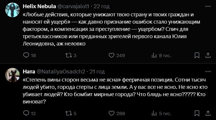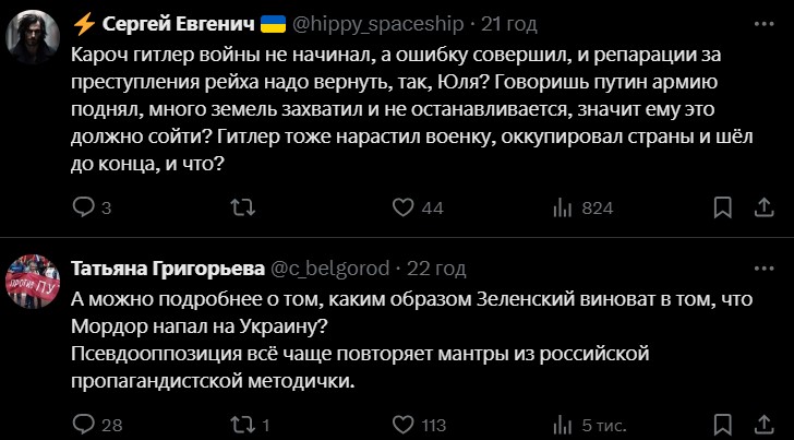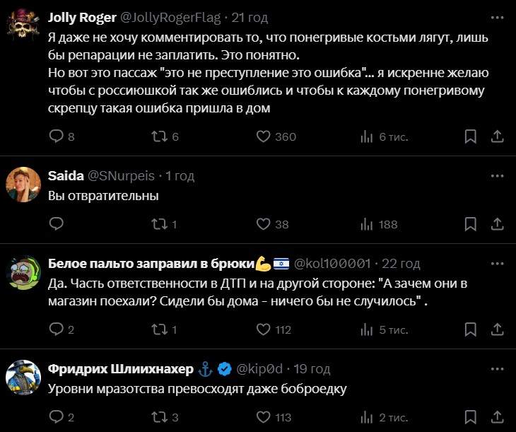 "Російські хороші росіяни взагалі перестали приховувати свою позицію стосовно російсько-української війни. Тези "усьо нє так адназначьна" і "вінавати всі сторони" вже звучать навіть не завуальовано, а цілком собі конкретно. Буча, Маріуполь і Бахмут порівнюється з ДТП де вина тої чи іншої сторони не очевидна. Яка ж вони мразота", - написав у Facebook українець Петро Волинський.